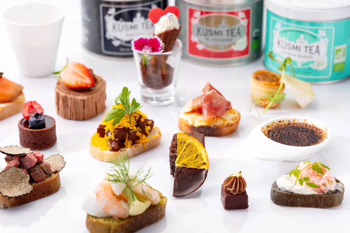 アフタヌーンティーを楽しむ際に欠かせないのが紅茶です。ここでは、パリの老舗ティーブランド「KUSMI TEA(クスミティー)」のオーガニックティーがフリーフローで提供されます。アールグレイやサンクトペテルブルク、ホワイトベリーニ、ルイボスアーモンドなど、豊かなフレーバーが揃っています。紅茶はチーズやショコラの濃厚さと見事にマリアージュし、さっぱりとした爽快感を与えてくれます。