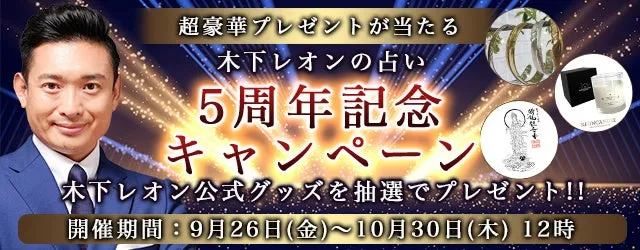 5周年記念キャンペーンは、木下レオンの占いを楽しむ絶好の機会です。公式サイトにアクセスして、会員登録を行い、特別なプレゼントを手に入れるチャンスを逃さないでください!運命を変えて、より素晴らしい未来に向かう第一歩を、この機会に踏み出してみましょう。