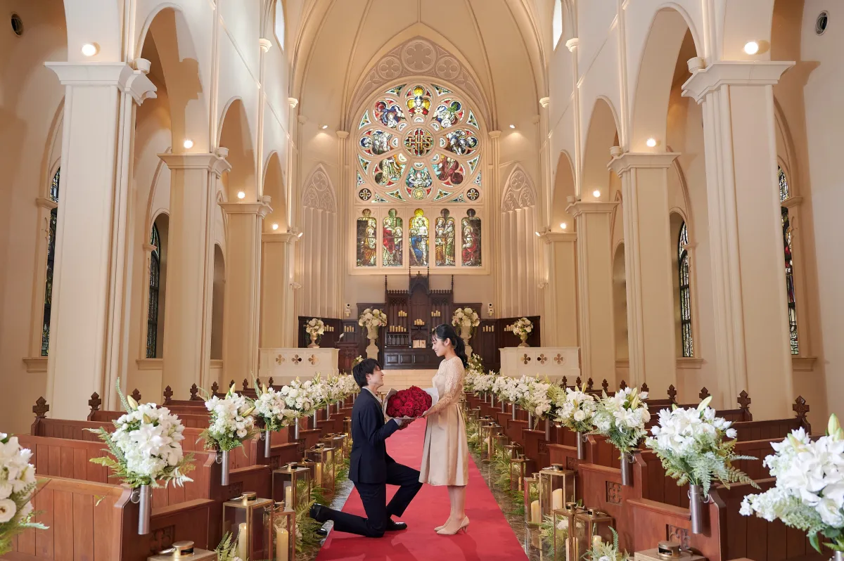 食事の後は、ライトアップされたチャペルに移動し、そこでプロポーズを行います。使用されるチャペルは、美しい赤のバージンロードが続く「大聖堂」。神秘的な光を放つ巨大なステンドグラスが印象的で、特別な瞬間を一層感動的に演出します。プロポーズの際には、「永遠の愛」を象徴する12本のバラの花束が用意されており、ロマンティックな演出が施されています。