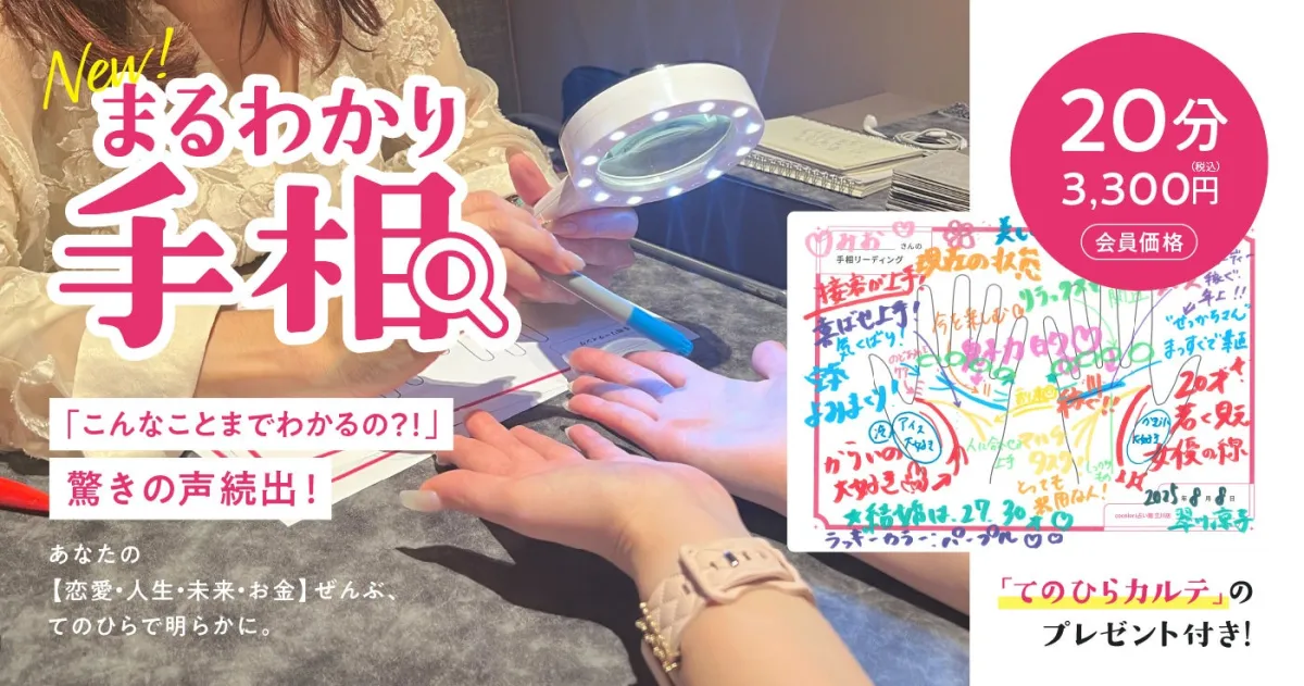 『まるわかり手相』は、約20分という短時間であなたの運命を紐解く占いメニュー。手のひらの線を通じて、性格や恋愛の傾向、適職、金運、将来の運気の流れなどをわかりやすく解説します。そして鑑定後には、世界に一つだけの『てのひらカルテ』が手に入る特典が付いています。このカルテはその日感じた気づきを記録し、手元に残ることでいつでも振り返ることができます。