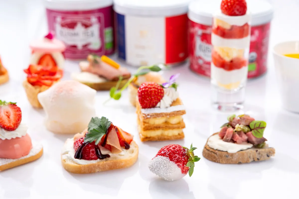 アフタヌーンティーの始まりを飾るウェルカムドリンクには「ストロベリー&ハニーフィズ」が用意されています。苺のフレッシュな味わいと蜂蜜のやさしい甘さ、そして炭酸の爽やかさが絶妙に入り混じり、心地良いスタートが切れます。また、飲み放題のフリーフローにはフランスのオーガニックティーメゾンKUSMI TEA(クスミティー)を取り揃え、料理やスイーツに合わせた紅茶を楽しむことができます。