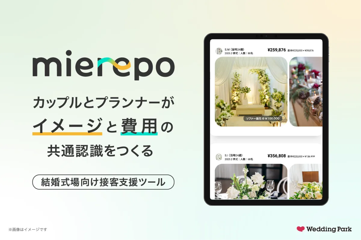 株式会社ウエディングパークが2026年春から提供開始する新しいサービス「mierepo(ミエレポ)」は、結婚式の「イメージ」と「費用」を一目で把握できる接客支援ツールです。このサービスは、過去に挙式したカップルの実例をレポート形式で提示することで、結婚式のリアルな姿をカップルに伝え、プランナーとの情報格差をなくすことを目的としています。