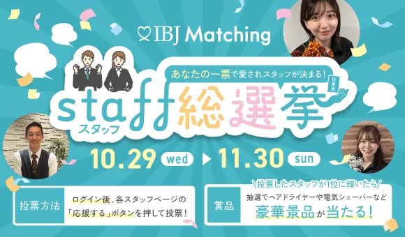 国内最大の成婚実績を誇るIBJが運営する婚活パーティーサービス「IBJ Matching」が、特別な取り組みとして「スタッフ総選挙」を実施します。この企画は、日々お客様に心を寄せて真摯に接しているスタッフの努力を評価するもので、投票を通じてお客様自身も参加できる機会を提供します。