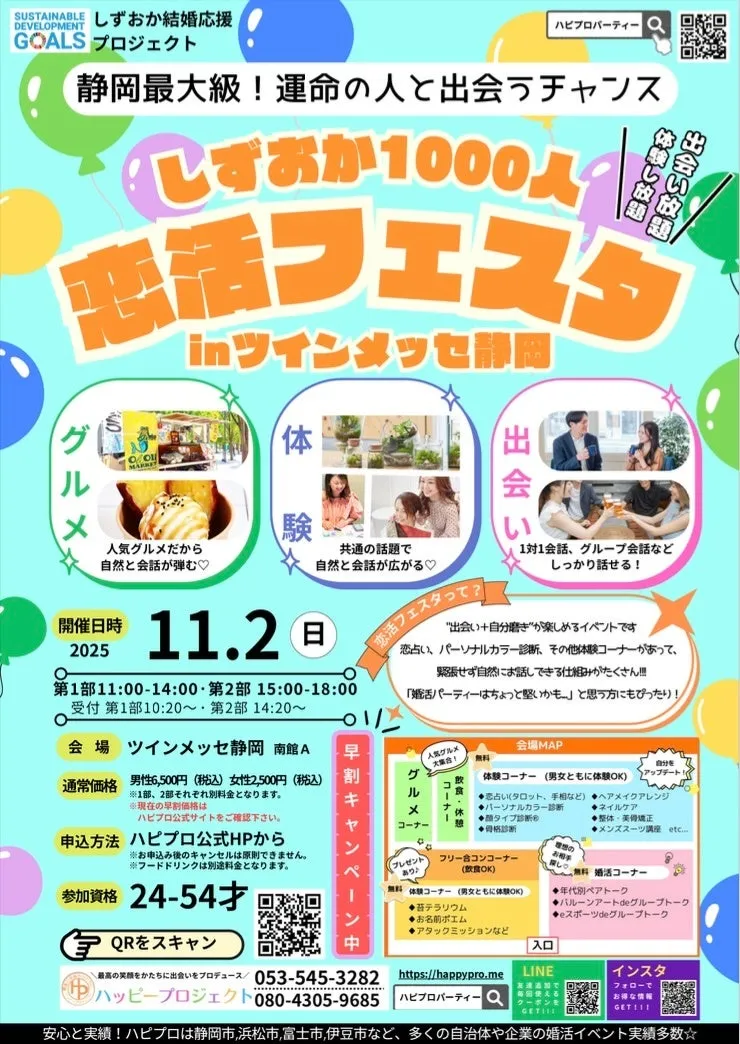 静岡県での出会いの場が新たに進化します。2025年11月2日(日)、ツインメッセ静岡にて「しずおか1000人恋活フェスタ」が開催されます。このイベントは、株式会社ハッピープロジェクトが主催し、これまでに15,000回以上の婚活パーティーを手がけてきた実績を持つ注目の催しです。