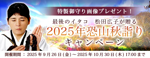 2025年9月26日から10月30日まで、松田広子の公式サイトにて「恐山秋詣りキャンペーン」が実施されます。このキャンペーンに参加することで、占い後に地蔵菩薩様のご利益が込められた「五穀豊穣の御守り画像」をプレゼントされる特典があります。