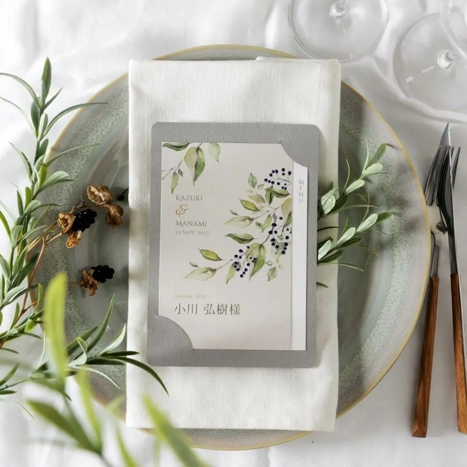 披露宴のテーブルに置かれるメニュー表と席札は、ゲストにとってどちらも欠かせないペーパーアイテムです。しかし、従来のスタイルではそれぞれ別に置かれるため、テーブルがごちゃごちゃしがちでした。そこで登場した「カルムリーフ」や「かすみ草」は、これら二つの役割をひとつにまとめました。これにより、テーブル上でのスペースを節約し、訪れるゲストに洗練された印象を与えます。