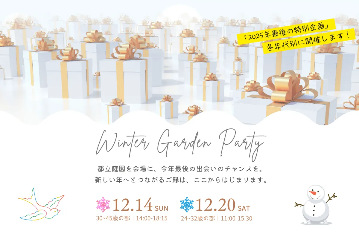 冬のガーデンパーティーで、新たな出会いを見つけるチャンスを掴んでみませんか?経験豊富な運営陣によるサポートのもと、素晴らしい出会いが待っています!