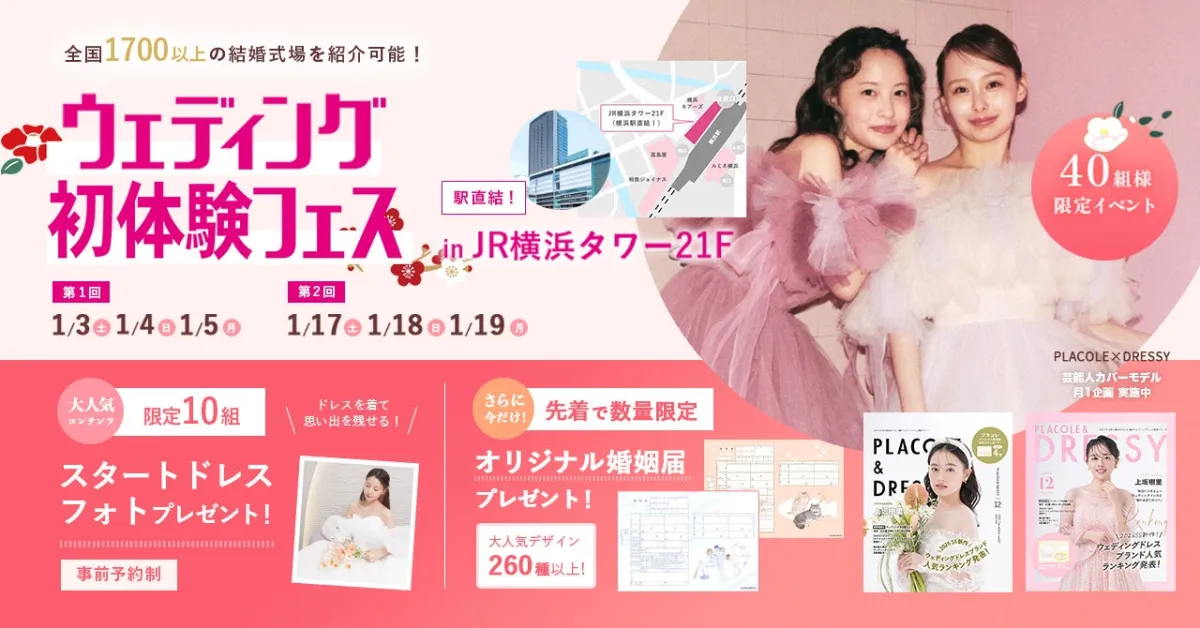 2026年の幕開けを祝う新たなイベント「ウェディング初体験フェス」が、1月3日から5日までの間、横浜駅の直結JR横浜タワー21階に位置する「DRESSY ROOM YOKOHAMA」にて開催されることが決定しました。このイベントは、婚約中のカップルが楽しく結婚準備を進めるための特別な機会です。