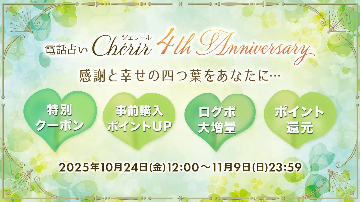 2025年10月24日、『Chérir(シェリール)』が見事にサービス開始から4周年を迎えることを記念して、特別なキャンペーンを開催します。この機会にぜひお得に占いを体験して、自分の気になる悩みを解決しましょう!