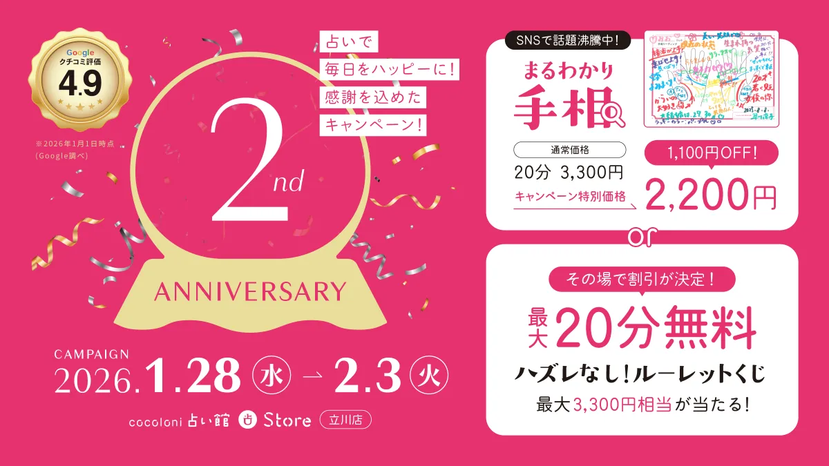 東京都立川市に位置する『cocoloni占い館』が2周年を迎えます。この特別な日を祝い、開催されるキャンペーンには、人気のロングセラーメニュー「まるわかり手相」が特別価格で提供されます。さらに、来店するお客様には嬉しいハズレなしのルーレットくじや、SNSに投稿することで得られる特典もあります。