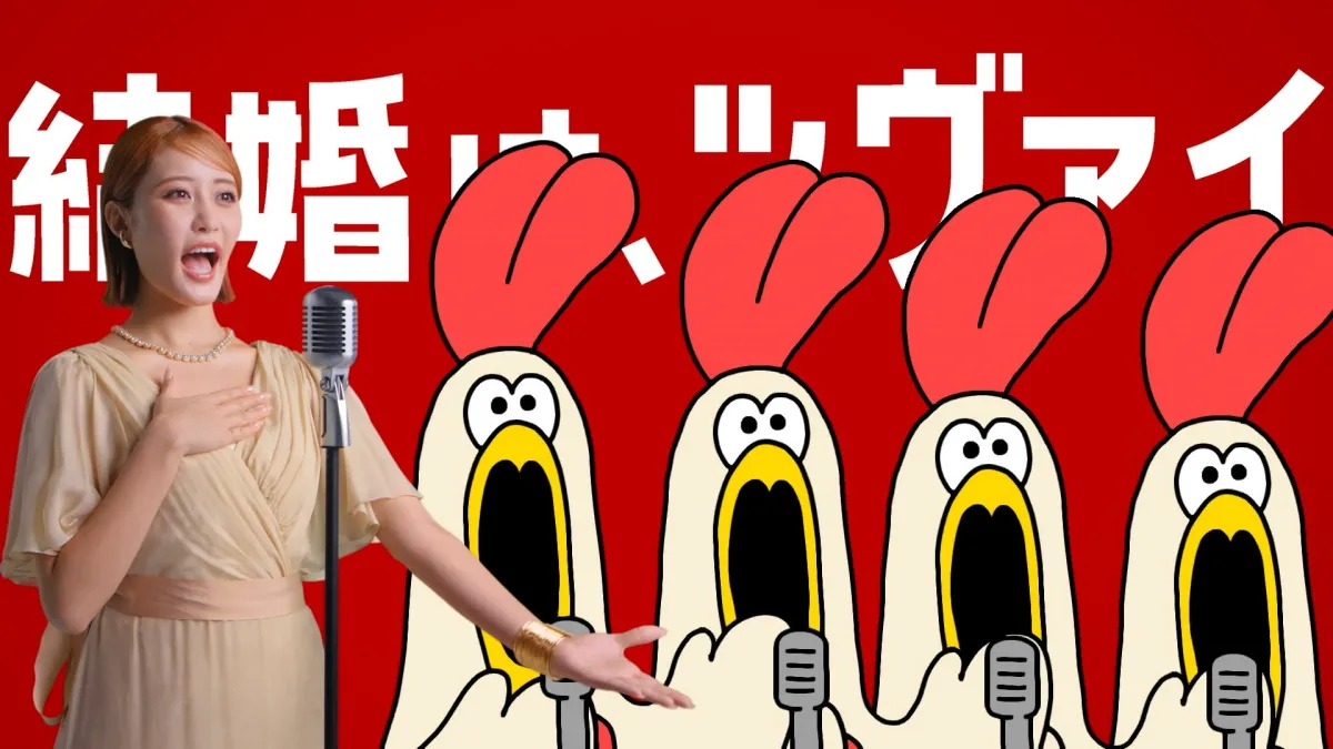 CMでは王林さんとコケッコンが見事なハーモニーを披露し、視聴者を楽しませる姿が印象的です。特に、王林さんの明るい声とコケッコンの華やかなコーラスが響き合い、婚活を楽しく積極的にしたいというメッセージがしっかりと伝わってきます。王林さんのニワトリモチーフの衣装も、幸運を招く存在としての象徴となっており、視覚的にも婚活の明るい未来を感じさせます。